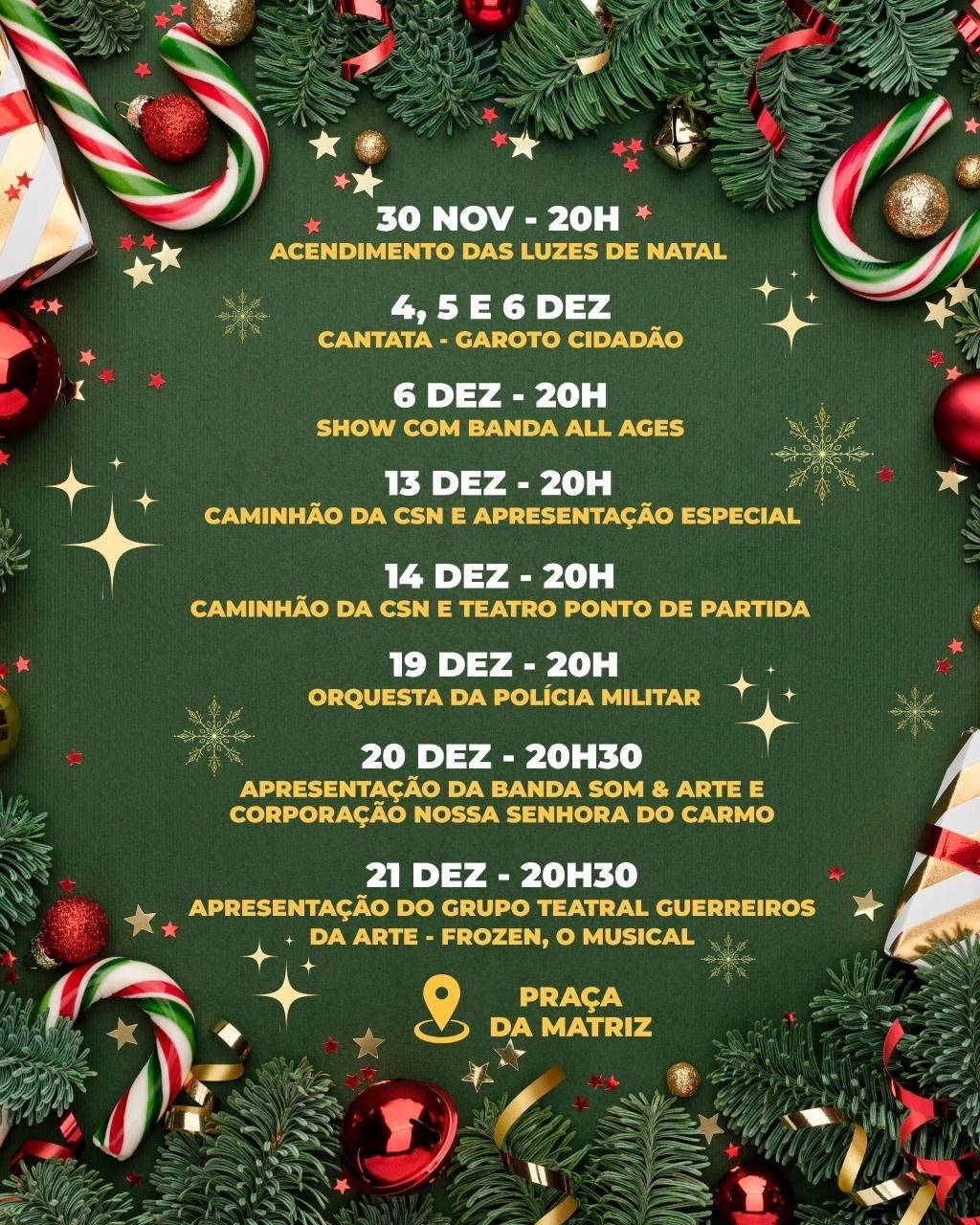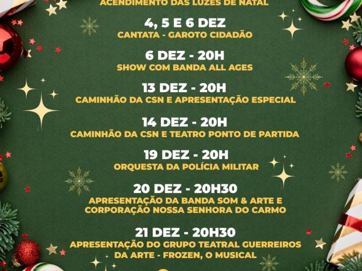 A cidade será embalada por cantatas, orquestras, bandas, teatro e até a presença do famoso Caminhão da CSN, levando alegria por onde passa. Entre os destaques, o show da banda All Ages, a apresentação do grupo teatral Guerreiros da Arte com o musical Frozen, e a força da Orquestra da Polícia Militar, que enche a praça de emoção e tradição.